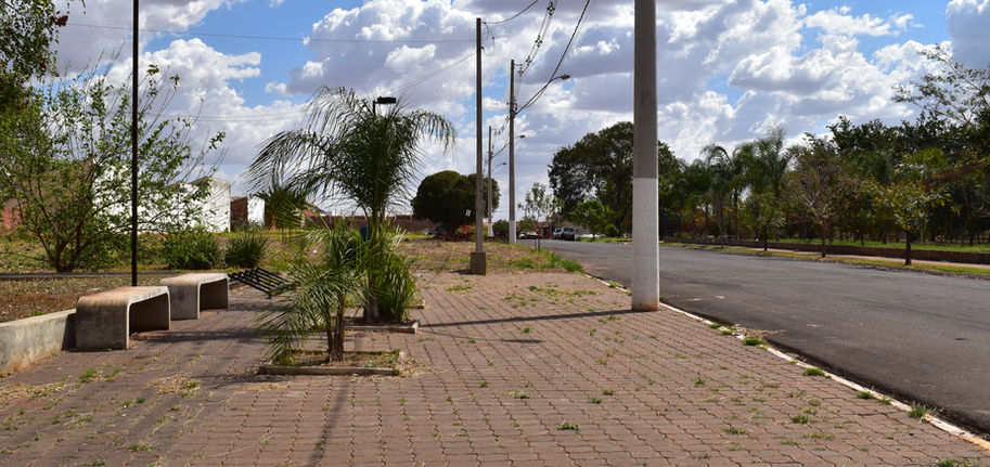 O local é composto por calçadas amplas com piso intertravado, bancos de concreto posicionados sob pequenas palmeiras e árvores ornamentais, além de postes de iluminação que garantem segurança e conforto durante o período noturno. A vegetação é bem distribuída e contribui para a sensação de frescor e acolhimento, tornando o espaço ideal para caminhadas, pausas ao ar livre e encontros informais.
